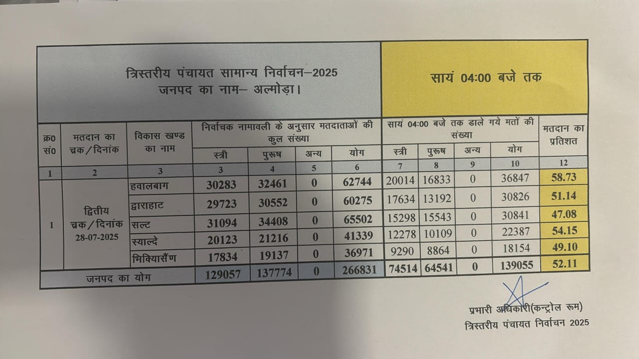 अल्मोड़ा। जनपद के त्रिस्तरीय पंचायत चुनाव के द्वितीय चरण के सभी ब्लॉकों में मतदान आज शाम 04 बजे तक 52.11 फीसदी मतदान हुआ। सर्वाधिक हवालबाग में 58.73% मतदान हुआ। द्वाराहाट में 51.14%, सल्ट में 47.08%, स्यालदे में 54.15% और भिक्यासैण में 49.10% मतदान हुआ।