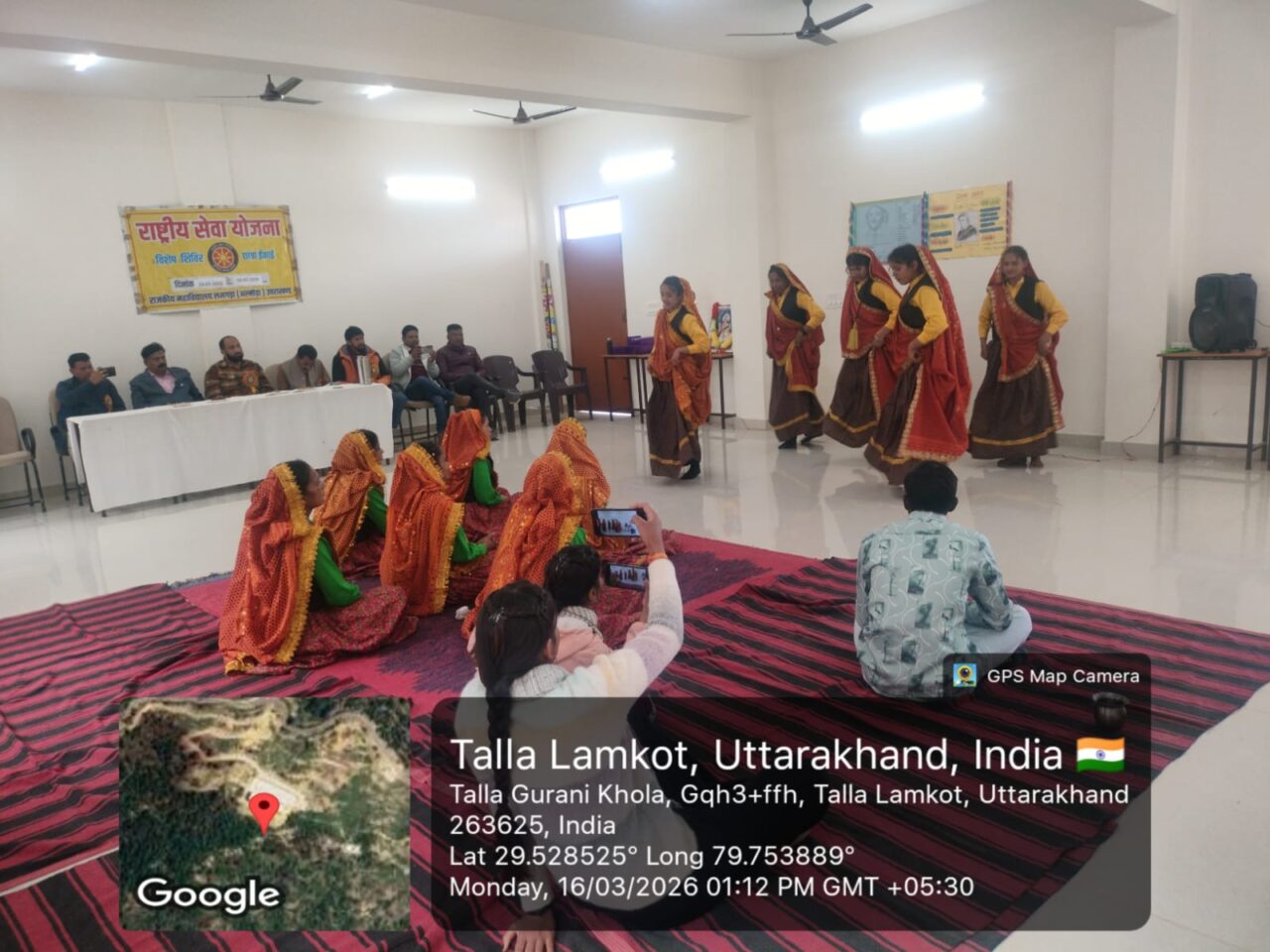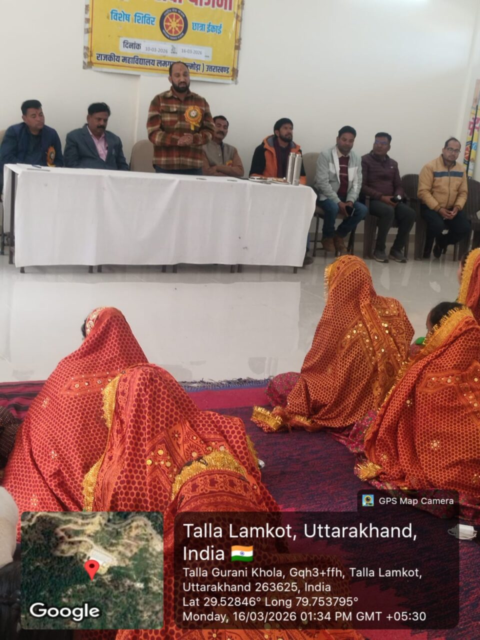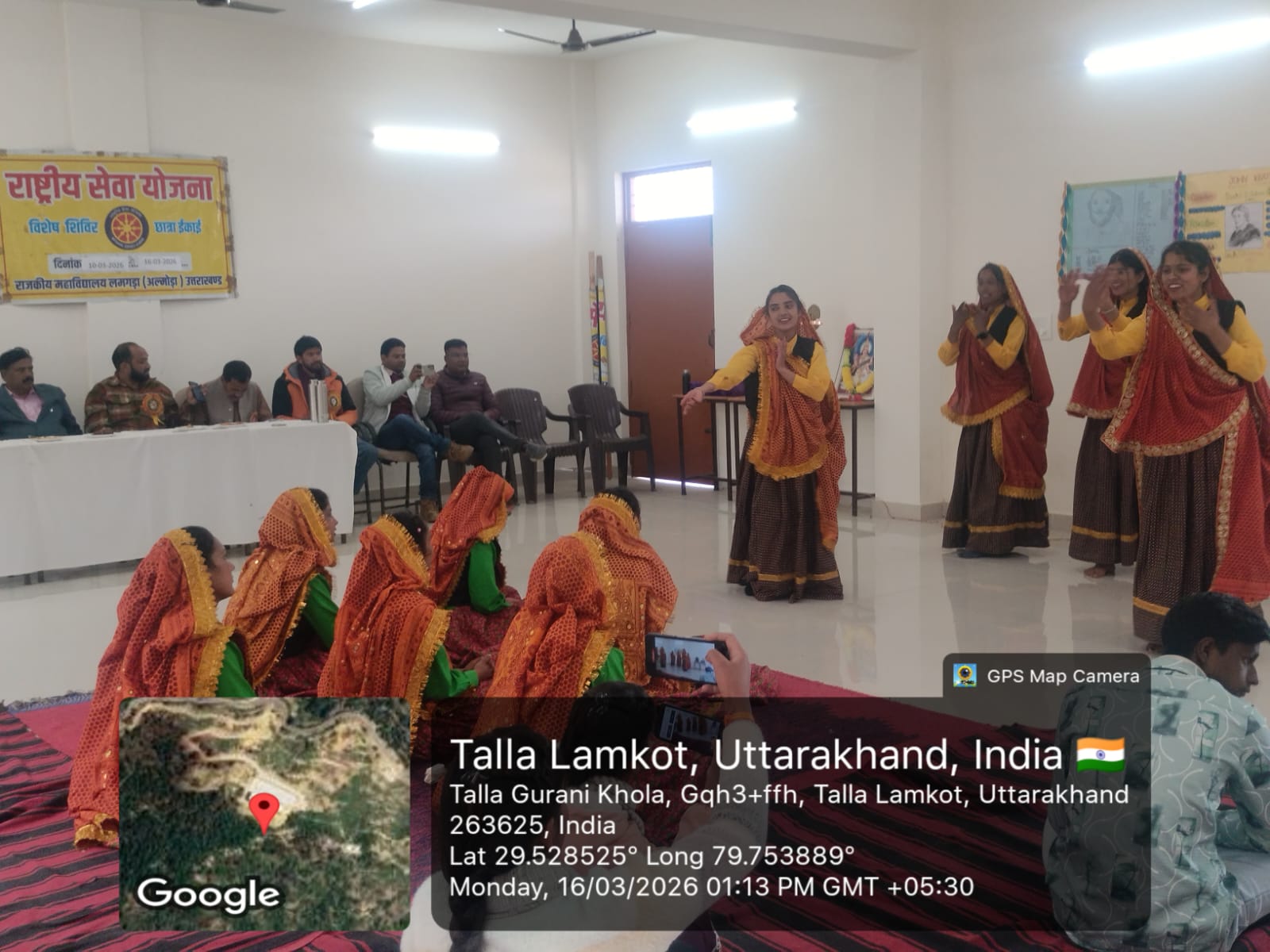 राष्ट्रीय सेवा योजना ईकाई द्वारा आयोजित सात दिवसीय विशेष शिविर का आज दिनांक 16-03-2026 को समापन समारोह राष्ट्र भक्ति की भावना के साथ आयोजित किया गया। इस अवसर पर मुख्य अतिथि के रूप में क्षेत्र पंचायत सदस्य गौलीमहर के माननीय श्री मनोज रावत जी. श्री मोहन सिंह नगरकोटी पूर्व ग्राम प्रधान गौलीमहर, एवं अभिभावक शिक्षक संघ के अध्यक्ष श्री दिनेश मलाडा जी उपस्थित रहें, तथा कार्यक्रम की अध्यक्षता महाविद्यालय के प्राचार्य महोदय द्वारा की गई। कार्यक्रम का शुभारम्भ अतिथियों द्वारा दीप प्रज्जवलन एवं स्वमसेवकों द्वारा सरस्वती वंदना से किया गया।