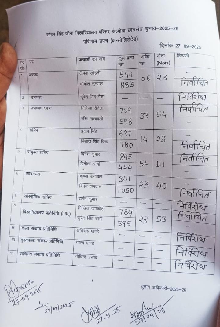 सोबन सिंह जीना विश्वविद्यालय, अल्मोड़ा परिसर हमेशा से छात्रों की राजनीति के लिए जाना जाता रहा है। यहां एनएसयूआई (NSUI) के अध्यक्ष पद उम्मीदवार प्रत्याशी लोकेश सिंह सुप्याल ने रिकार्ड तोड़ मतों से जीत दर्ज की है। उनकी जीत सामान्य छात्रों और कांग्रेस समर्थकों में जबरदस्त उत्साह का कारण रहा।