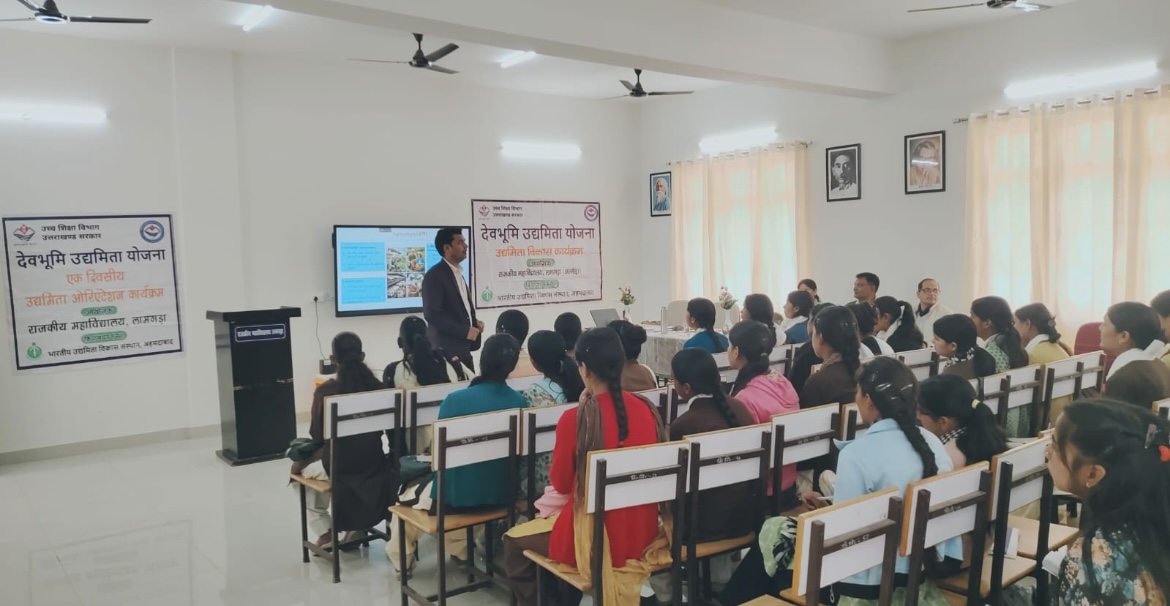 आज दिनांक 01 अप्रैल 2026 को राजकीय महाविद्यालय, लमगड़ा (अल्मोड़ा) के सभागार हॉल में “देवभूमि उद्यमिता योजना” के अंतर्गत एक दिवसीय ओरिएंटेशन कार्यक्रम का सफलतापूर्वक आयोजन किया गया। कार्यक्रम का मुख्य उद्देश्य छात्र-छात्राओं को उद्यमिता के महत्व से अवगत कराना, स्वरोजगार के अवसरों की जानकारी प्रदान करना तथा उन्हें आत्मनिर्भर बनने हेतु प्रेरित करना था।