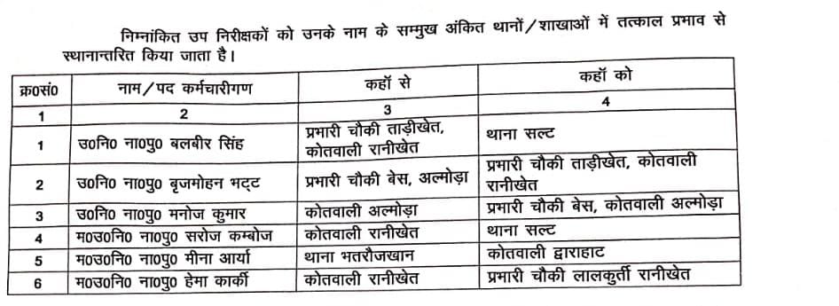 वरिष्ठ पुलिस अधीक्षक अल्मोड़ा देवेन्द्र पींचा द्वारा जनपद में पुलिसिंग और जनसंपर्क को बेहतर बनाने एवं कानून व्यवस्था को और अधिक सुदृढ़ एवं प्रभावी बनाने के उद्देश्य से थानाध्यक्षों/चौकी प्रभारियों के तबादले किए गए हैं। साथ ही नवसर्जित कोतवाली सोमेश्वर,द्वाराहाट व चौखुटिया में प्रभारी निरीक्षकों को जिम्मेदारी सौपी गयी। सभी अधिकारियों को तत्काल प्रभाव से नवीन तैनाती पर कार्यभार ग्रहण करने के निर्देश दिए गए हैं।